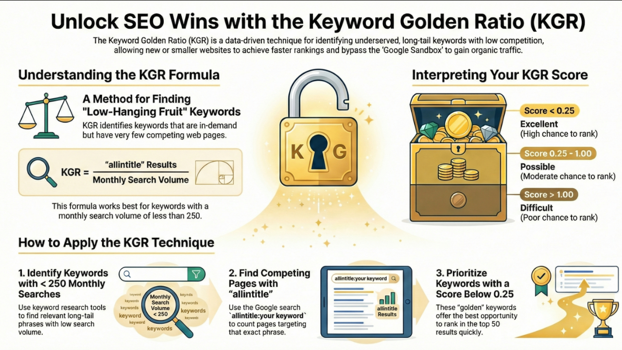 If you have ever spent weeks writing a blog post only to watch it vanish into the depths of Google's search results, you are not alone. Most website owners target keywords that are far too competitive, then wonder why the traffic never arrives. The Keyword Golden Ratio (KGR) offers a smarter path. It is a data-driven keyword research method that helps you find low-competition, long-tail keywords your site can realistically rank for — often within days, not months.